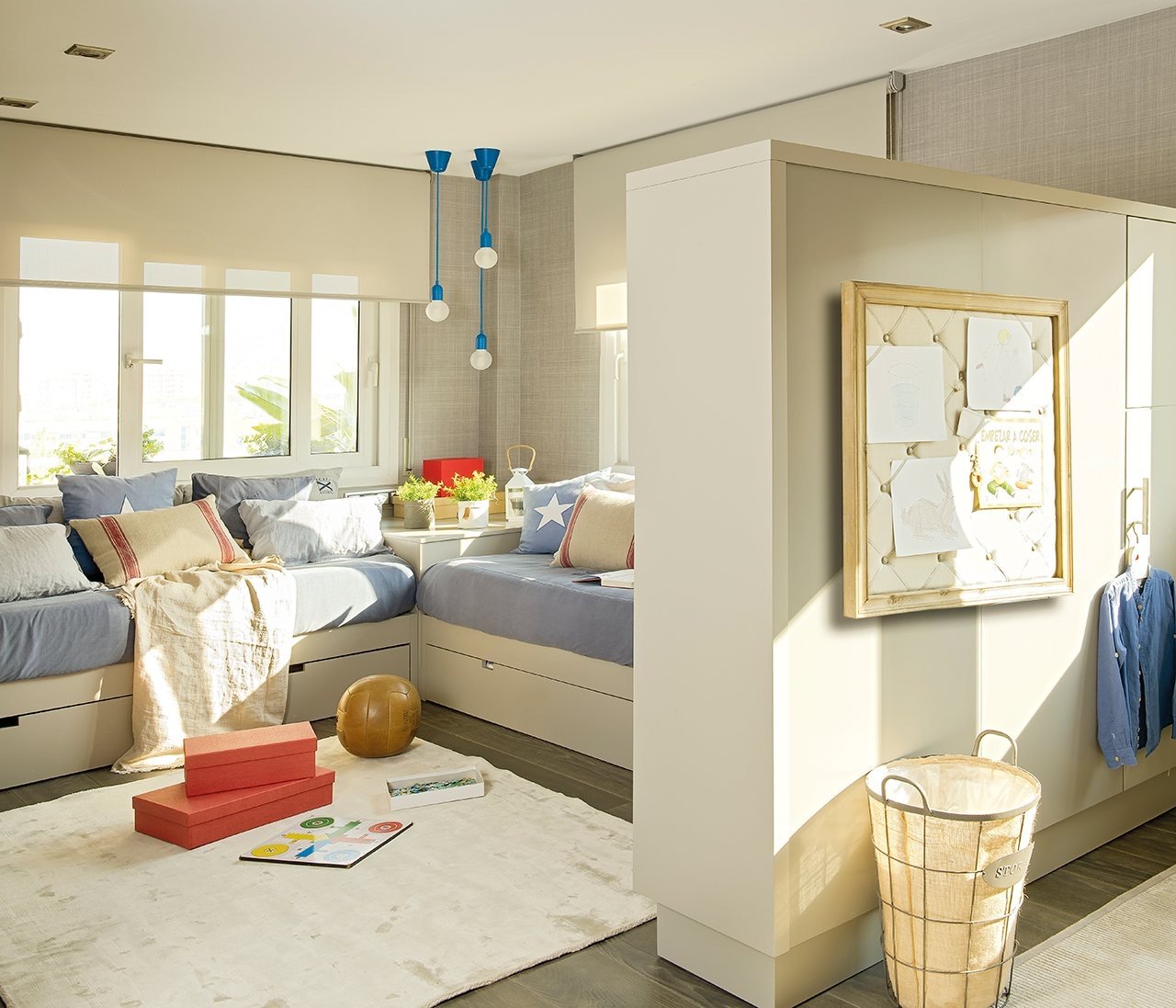 Originalmente habian dos pequeñas habitaciones y propusimos derribar el tabique que las separaba para formar un amplio dormitorio, con zona de descanso y zona de estudio zonificadas, gracias a un mueble separador.